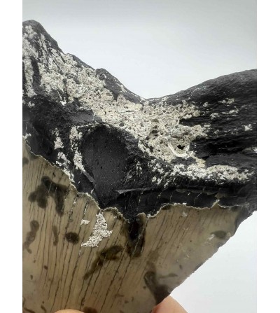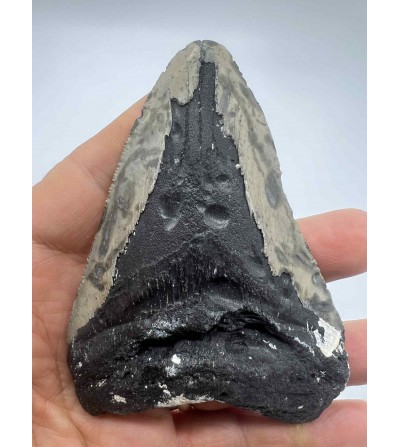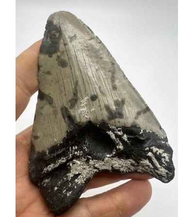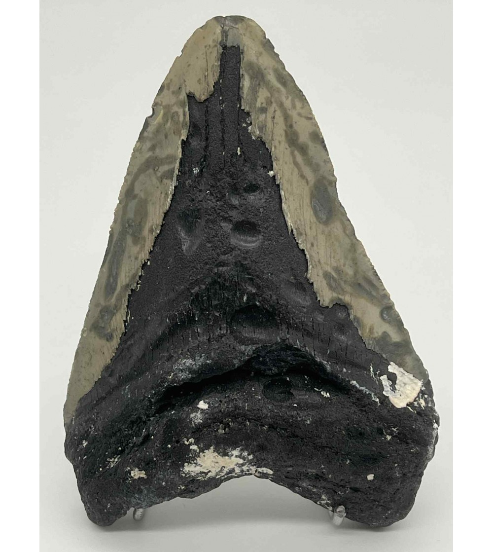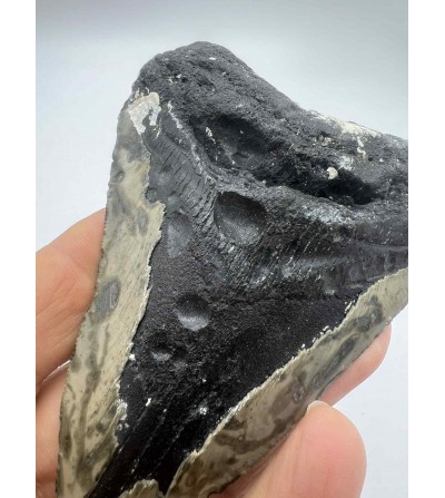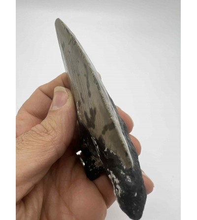 Avec ses 10 cm, cette dent présente une racine robuste, un émail bien conservé et des dentelures visibles, caractéristiques de ce célèbre requin préhistorique ayant vécu entre le Miocène et le Pliocène.